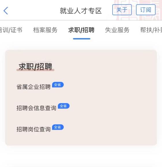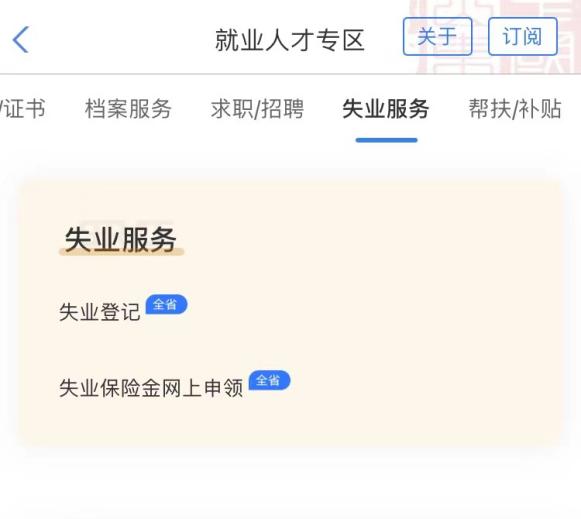 该专区汇聚就业人才常用的特色服务应用,覆盖就业登记、证书查询、档案服务、求职服务、失业服务以及帮扶补贴等服务。