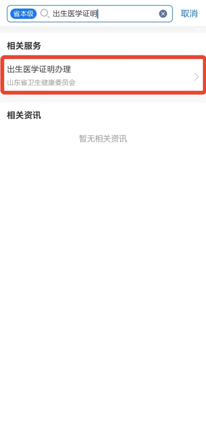 1.打开“爱山东”APP,首页搜索“出生医学证明”,点击进入(详见图1)。