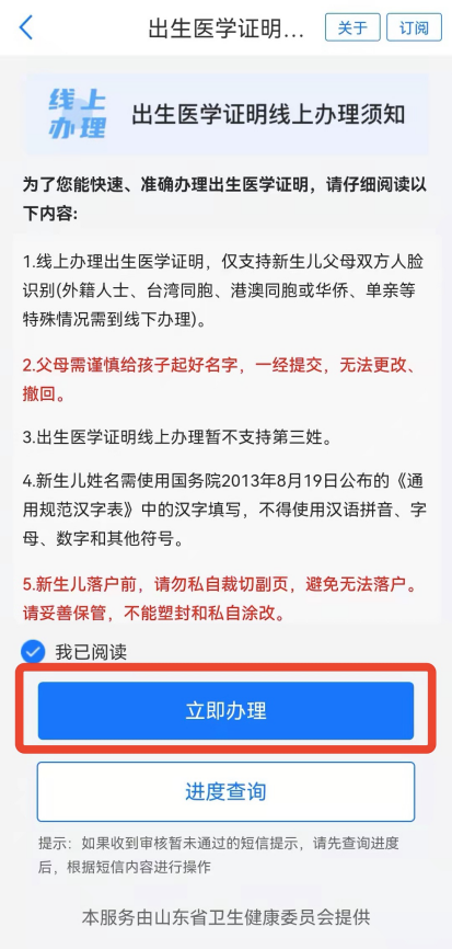 2.阅读《办理须知》后勾选“我已阅读”,点击【立即办理】(详见图2)。