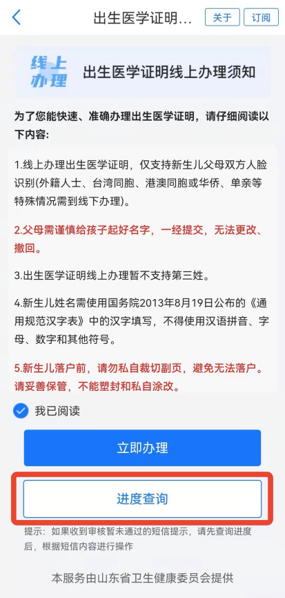 4.申请成功后,可在“出生医学证明办理”服务首页进行办理进度查询(详见图4)。