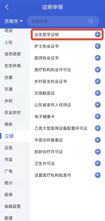 5.办理成功后,在“我的-我的证照”处,选择卫健类型下的“出生医学证明”,点击“+”,申领电子证照(如图5)。