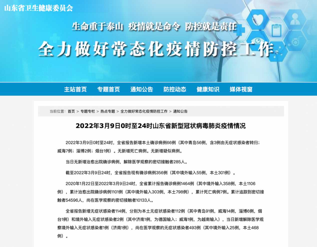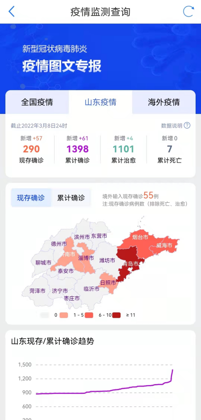 2022年3月9日0时至24时,山东全省报告新增本土确诊病例66例(其中青岛56例,含3例由无症状感染者转归;威海7例;淄博2例;烟台1例)。