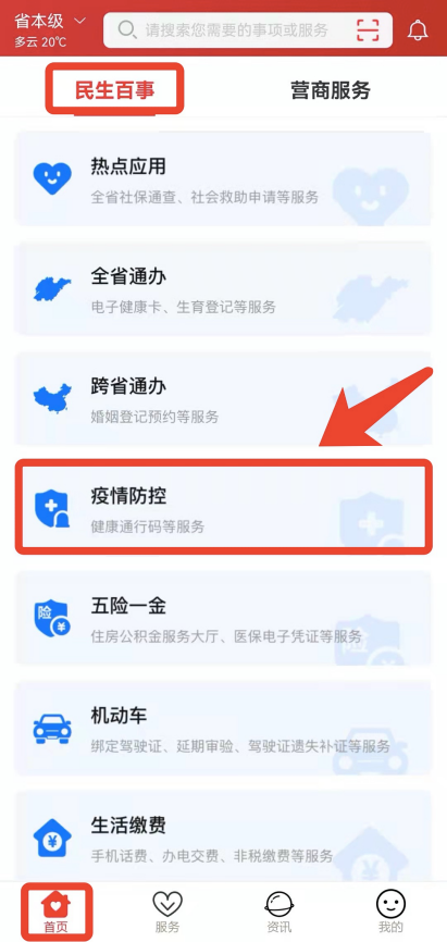 (1)打开“爱山东”APP,在首页“民生百事”中找到【疫情防控】专区并点击进入(详见图1、图2)。