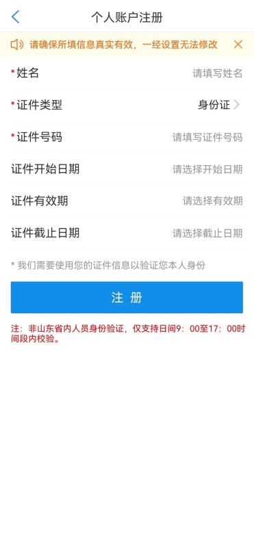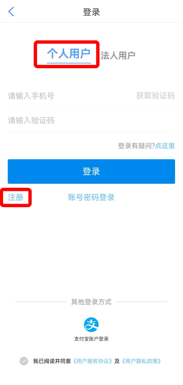 2、安装完成后,打开“爱山东”APP,逐步点击【我的】-【请登录】-【注册】,使用手机号+短信验证码注册账户。(个人用户也可以选择【其他登录方式】中的【支付宝用户登录】进行关联登录)。