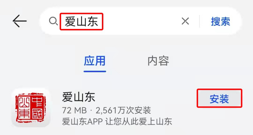 1、在手机应用商店/市场搜索“爱山东”,点击“安装”。
