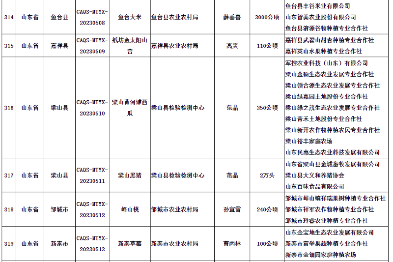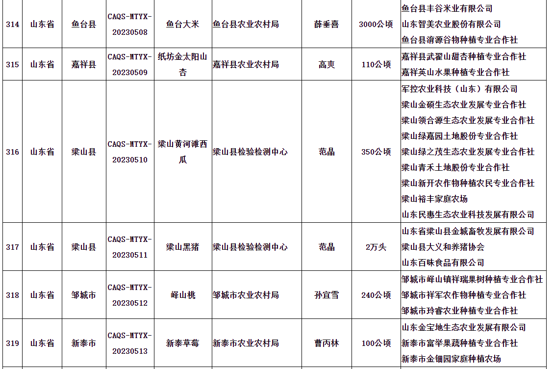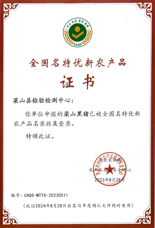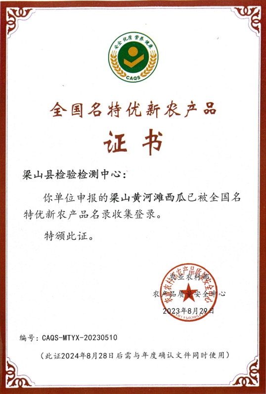 近日,农业农村部农产品质量安全中心公布2023年第二批全国名特优新农产品名录。梁山县检验检测中心申请的“梁山黄河滩西瓜”、“梁山黑猪”被纳入全国名特优新农产品名录,并荣获“全国名特优新农产品证书”。