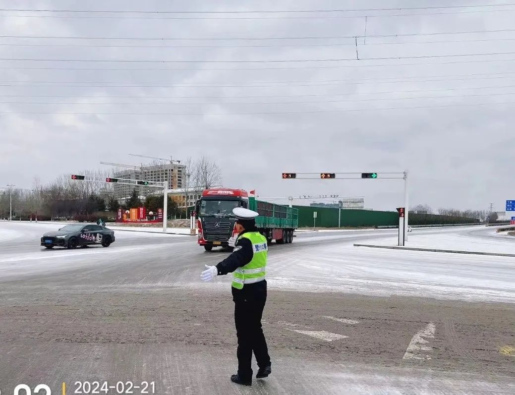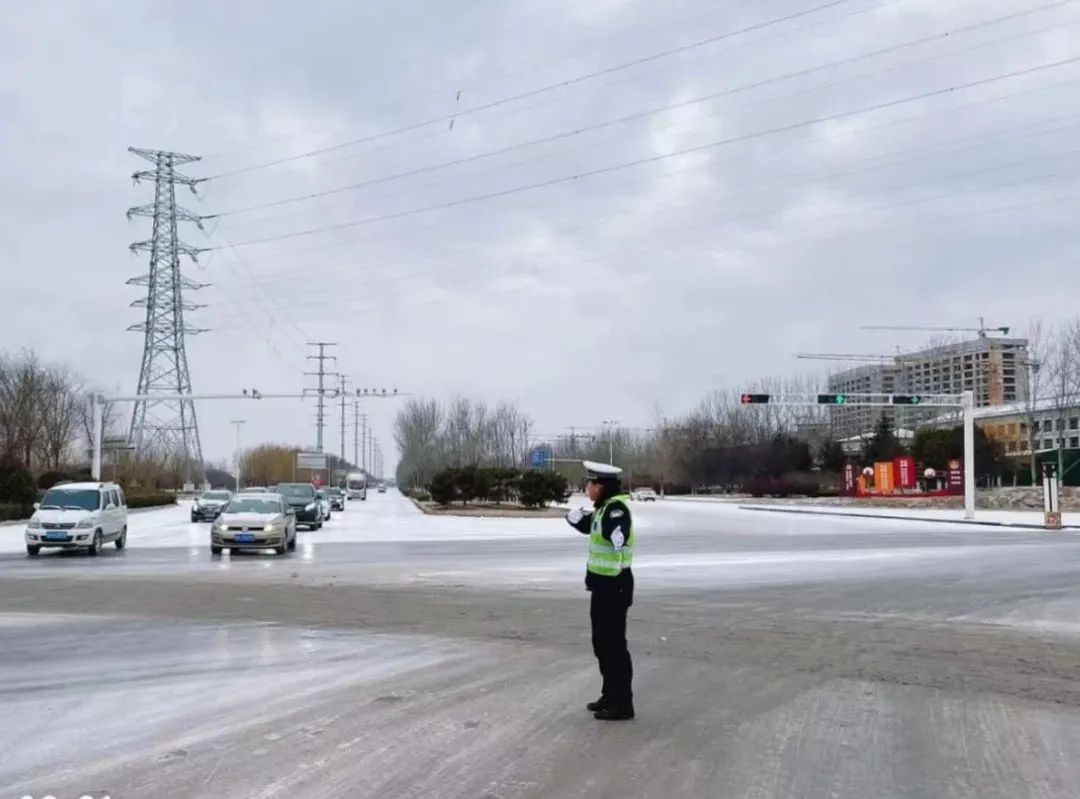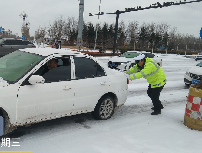 21日清晨,路面已经有了积雪,经过的车辆都缓慢行驶,行人小心翼翼。交警们已经早早在路面疏导交通,在风雪中坚守自己的岗位,帮助群众推车,有的还在路上铺洒防滑沙,提醒司机雪天路滑谨慎驾驶。