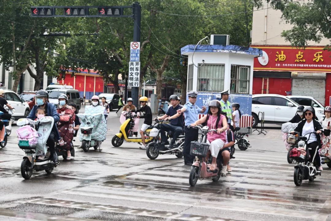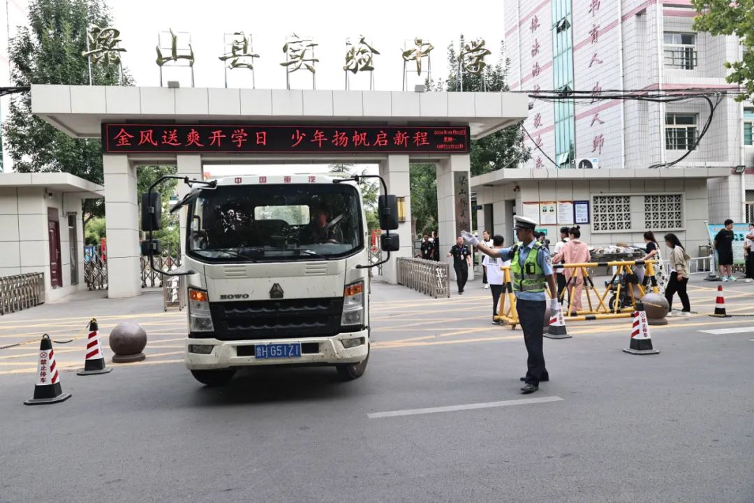 梁山县公安局提前谋划,助学岗民警早早来到学校门口,全力以赴开展现场引导、维护、车辆疏导工作,