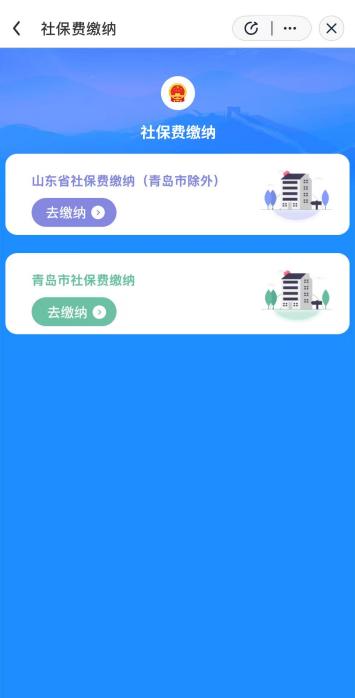 2.山东省(除青岛外)参保人员点击“山东省社保费缴纳(青岛市除外)”;青岛市参保人员选择“青岛市社保费缴纳”入口。