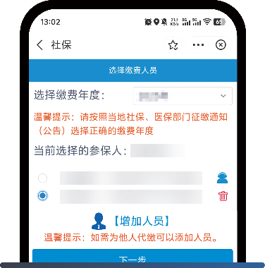 3. 选择缴费年度与参保人,若需添加新人员,可点击下方的“增加人员”按钮进行操作,确认无误后进入下一步。