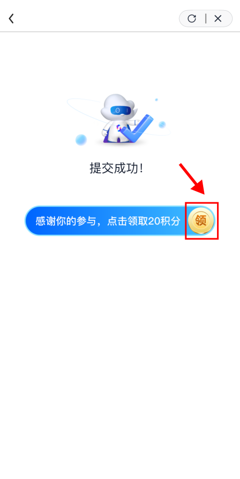 3.问卷填写完成,需选择所在地区,点击“提交”按钮。待提交成功跳转至领取积分页面时,点击“领”字,即可获得“爱山东”20积分。(每位用户共有10次参与机会,每次成功参与后将获得“爱山东”20积分。)