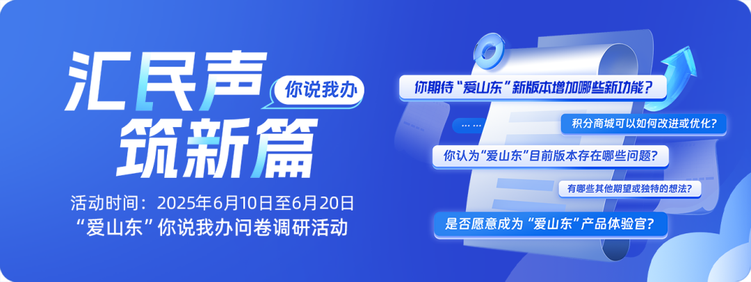 6月10日,“爱山东”政务服务平台“你说我办”问卷调研活动正式启动。活动启动后,广大用户积极参与,围绕使用体验与办事需求,为“爱山东”新版本建设贡献提出了诸多宝贵意见和建议。每一份反馈,都是推动平台优化升级、助力政务服务提升的重要力量。