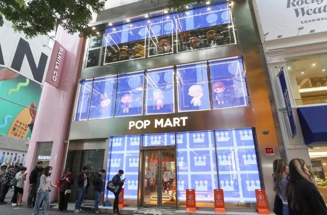 △2025年5月20日,顾客在韩国首尔明洞街区的泡泡玛特店面前排队。