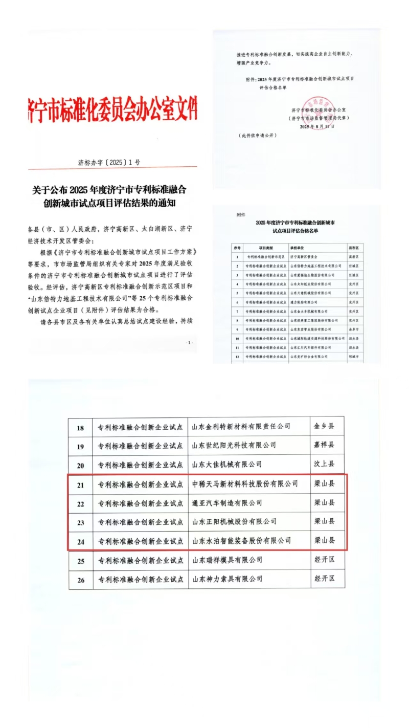 创新驱动发展,标准引领未来。专利是技术的“护城河”,标准是产业的“通行证”,它们的强强联合,正成为抢占发展先机、锻造核心竞争力的硬核密码。梁山县严格落实标准化战略部署,指导通亚汽车制造有限公司、中烯天马新材料科技股份有限公司、山东正阳机械股份有限公司、山东水泊智能装备股份有限公司4家企业开展并顺利通过专利标准融合创新试点验收,其中通亚汽车被市局评为“专利标准融合典型案例”。