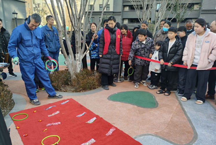 社区工作人员、物业代表与居民代表齐聚一堂,共同复盘全年社区建设与园区服务的点点滴滴,畅谈过往收获,展望新年发展蓝图,围绕民生关切的小事各抒己见,凝聚共识,为新一年的社区共建敲定清晰方向,现场氛围热烈又融洽。座谈会结束后,广场上的套圈活动即刻拉开帷幕,一排排憨态可掬的小马玩具整齐列队,成了小朋友们的“主攻目标”。孩子们手握彩色套圈,踮脚瞄准、奋力一掷,套中时的欢呼声响彻园区,没套中的也不气馁,捡起套圈再来一次。现场人员纷纷融入欢乐之中,有人帮孩子校准投掷角度,有人在旁呐喊助威,还有人亲自上阵体验套圈乐趣,邻里之间互相打趣、分享技巧,整个广场都洋溢着热闹喜庆的氛围。
