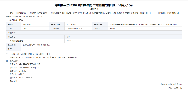 梁山县自然资源和规划局国有土地使用权招拍挂出让成交公示202612
