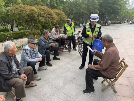 借着广场人流集中、老年群众聚集的有利契机,大队宣传民警同步开展交通安全宣传。民警向等候体检、过往散步的老年群众,面对面发放交通安全宣传资料,结合老年人出行特点,重点讲解横穿马路、闯红灯、骑行电动车不戴头盔、违法载人、逆行等常见交通陋习的安全隐患。