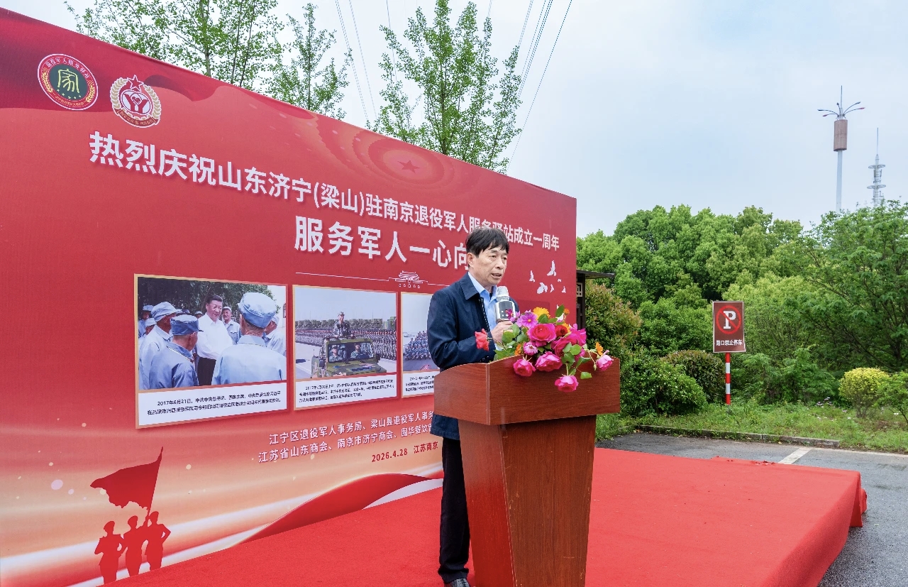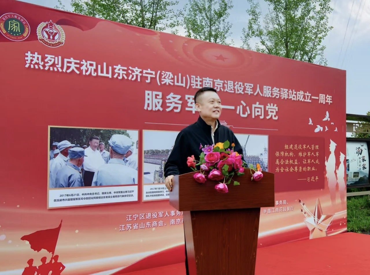 为持续深化退役军人服务保障体系建设,传递家乡对在苏济宁(梁山)籍退役军人的关怀与牵挂,4月28日,山东济宁(梁山)驻南京退役军人事务驿站成立一周年纪念活动,在江宁区汤山半亩江南驿站温馨启幕。梁山县退役军人事务局副局长宋进格带队参加活动仪式,在苏山东籍老领导吕先景、徐超、张成元应邀出席,南京市江宁区退役军人事务局党组书记、局长何春生,句容市退役军人事务局副局长牛风华协同指导;江苏省山东商会党委书记、会长石金亮,副会长(南京市济宁商会会长)傅清天,党委副书记、副会长亓文才,济宁(梁山)驻南京退役军人事务驿站站长张广璐,以及退役军人代表、江苏省山东商会与南京市济宁商会部分会员参加活动。共庆驿站周岁华诞,共话退役军人服务发展。
