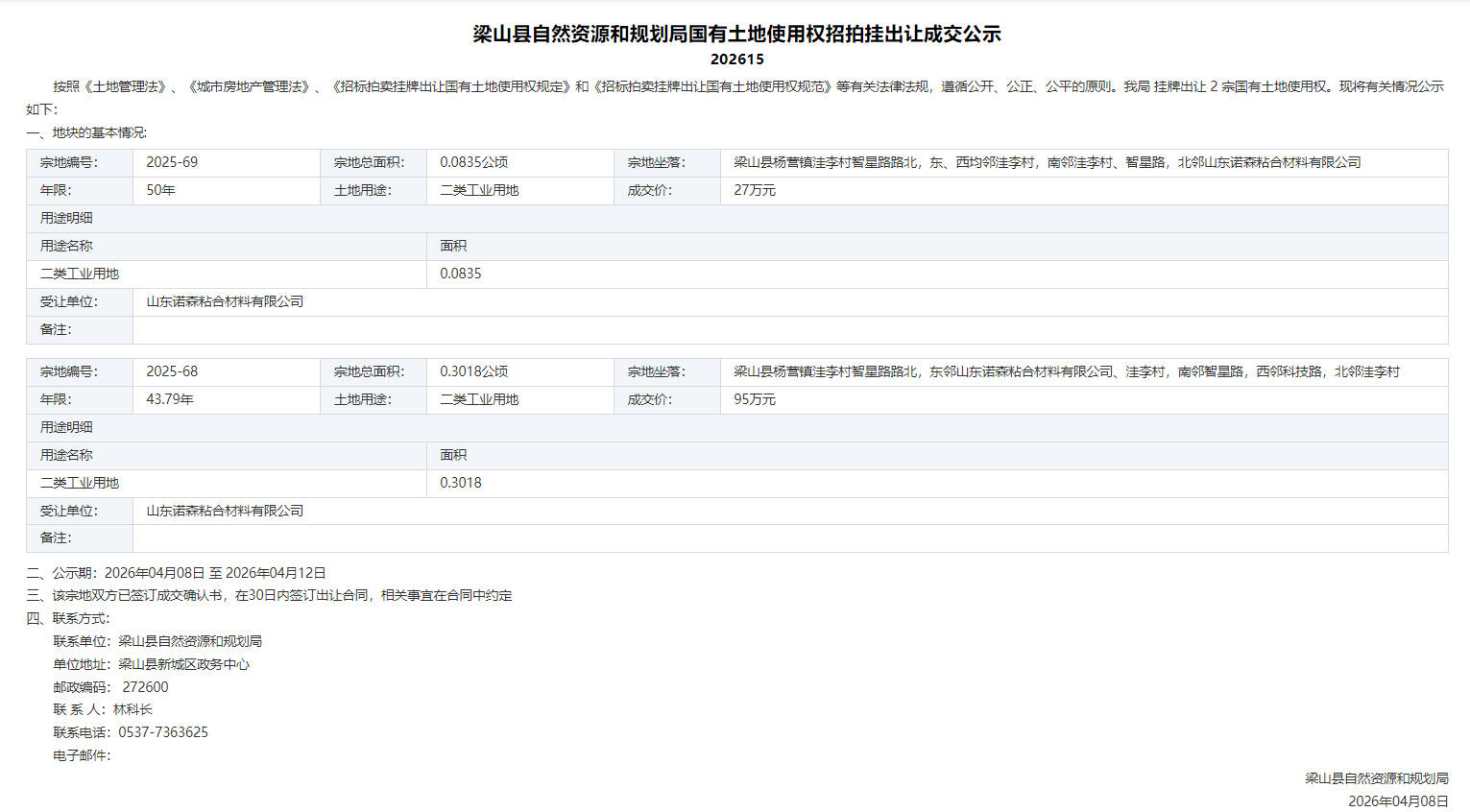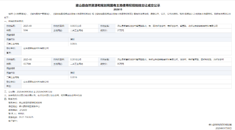 梁山县自然资源和规划局国有土地使用权招拍挂出让成交公示202615