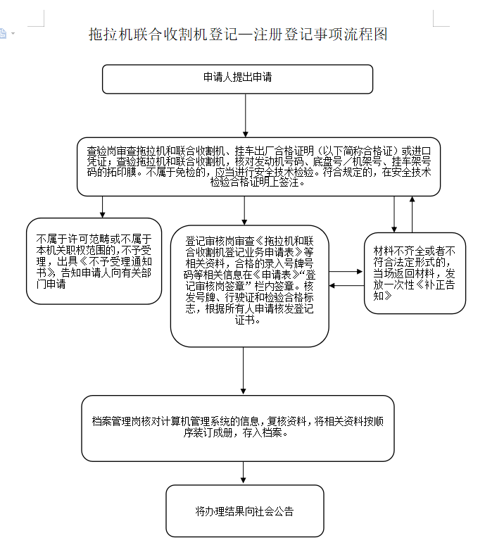| 受理 | 填写申请表,交验拖拉机、联合收割机,提交《拖拉机和联合收割机登记业务申请表》、所有人身份证明、来历证明、合格证或进口凭证、安全技术检验合格证明、整机照片,拖拉机运输机组还应当审查交通事故责任强制保险凭证。 | 0个工作日 | 受理记录 |